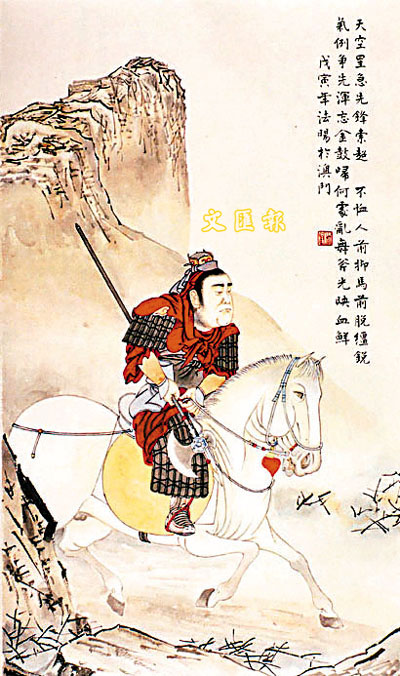 只見將台上又把青旗招動,繼而第三通鼓響,左邊陣內門旗下,鸞鈴響處,閃出正牌軍索超。
