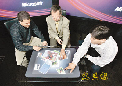 美國電腦巨擘微軟公司周三在加州卡爾斯巴德舉行的科技會議上,展出外形類似咖啡桌的輕觸式屏幕電腦(見圖),用家只需輕觸這部名為「Surface」的電腦屏幕就可與電腦進行互動。微軟表示,「Surface」電腦每台售價介乎5,000至1萬美元﹙約3.9萬至7.8萬港元﹚,3至5年後將可推出消費級的「Surface」個人電腦。預料首批「Surface」電腦將於今年11月在美國市場有售。 ■美聯社/路透社
