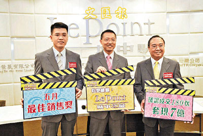 ■長實副首席經理(營業)郭子威(中),楊聰永(左)及南豐集團董事兼地產部總經理麥一擎(右)催谷城中之城2房單位。本報記者張偉民 攝