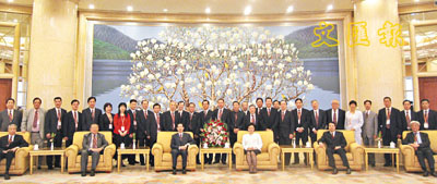 ■國務院僑辦主任李海峰、副主任許又聲等領導與訪京團成員合影。