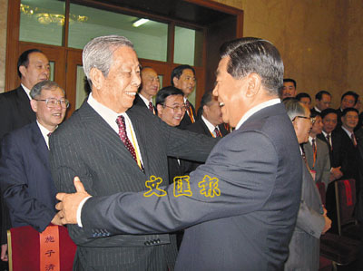 ■賈慶林主席與施子清名譽團長熱情擁抱。