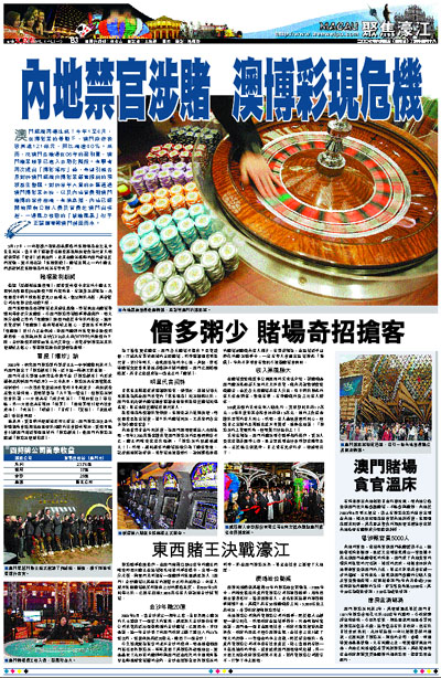 澳門經濟再傳佳訊!今年1至4月,在博彩業的帶動下,澳門政府稅收高達121億元,同比增逾40%。然而,從澳門各賭場在06年的盈利看,澳門賭業競爭已進入白熱化階段。有學者再次提出「博彩爆炸」論,希望引起各界對於澳門經濟向博彩業嚴重傾斜的現狀產生警醒。對於每年大量的外匯通過澳門博彩業外流,以及內地官員到澳門賭博的案件激增,有消息指,內地已經開始限制公職人員及官員赴澳門出境遊,一場風力強勁的「禁賭風暴」似乎正醞釀著朝澳門撲面而來。