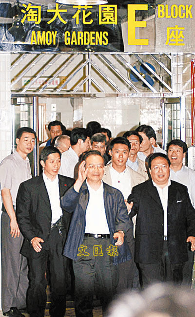 ■溫家寶總理(前中)03年6月30日到淘大花園E座單位探訪居民。資料圖片