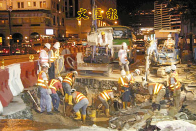 ■九鐵九龍南線梳士巴利道地面出現沉降,九鐵工程人員到場漏夜搶修。本報記者鄺福強 攝