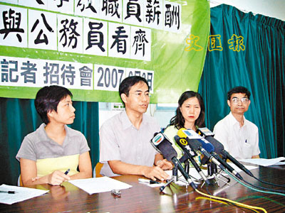 【本報訊】(記者 歐陽杏櫻) 6間大專院校的職工會及教協發表聯合聲明,批評大學教職員自04年至05年先後隨公務員減薪共6%後,各院校近年多項節流措施,如削減人手等,直接打擊職員的士氣,甚至引發流失潮,影響大學教學質素。故計劃進行各院校員工加薪意願調查,並會把結果遞交本月尾舉行的八大校長會,亦會約晤教統局官員,爭取當局把大學教職員薪酬與公務員「平起平坐」。