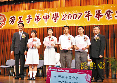 ■梁振英(左)向勞工子弟中學畢業學生頒獎。右一為校長齊忠森。 本報記者任智鵬 攝