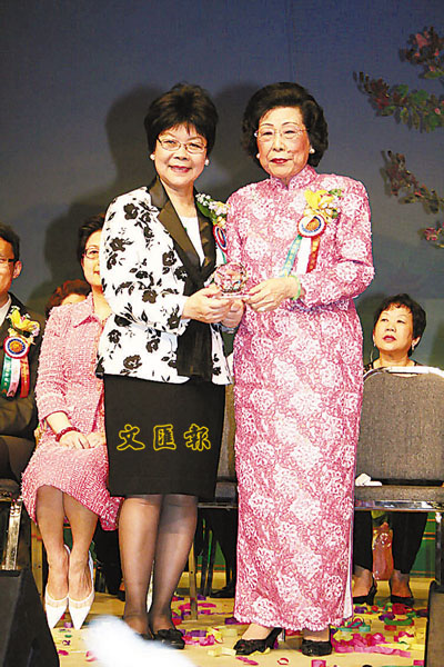 ■國際婦女會主席徐余梅馨向中聯辦特邀顧問、該會榮譽會長陳鳳英致送紀念品。