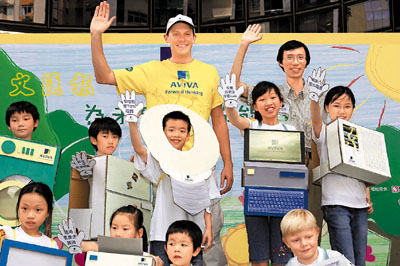 ■Aviva人壽保險總經理聶世文與香港地球之友總幹事劉祉鋒帶領一眾慳電小精英宣傳環保意識。