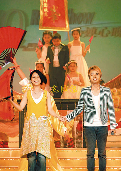 【本報訊】(記者 李思穎)李克勤、楊千嬅、衛詩、呂方、鍾鎮濤等20多位歌手,前晚參與《RoadShow慶回歸心連心晚會》演出,各歌手都悉心打扮到場,克勤就以潮版西裝上衣上陣,Jill特以低胸紅色裙來賀回歸,應昌佑亦特地穿上紅襪子喜慶一番,而呂方和當晚擔任司儀之一的女友嘟嘟亦安排同台,氣氛熱鬧。