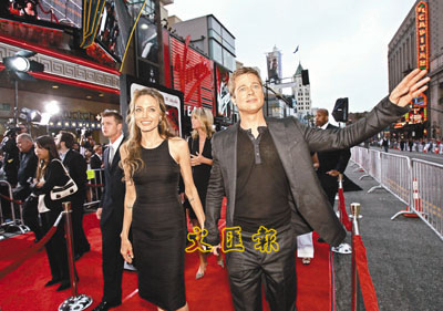 ■畢彼特拖著安祖蓮娜祖莉,大行「盜海」紅毯。美聯社