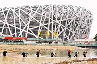 ■工人為鳥巢人工河試水。新華社
