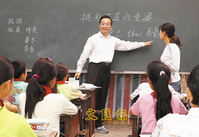 ■5日,溫家寶來到雲南普洱市地震災區,檢查抗震救災工作,慰問受災群眾。圖為溫家寶在新平村小學給孩子們上課。新華社