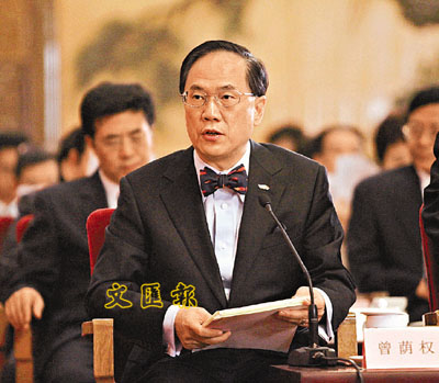 ■正在天津訪問的特首曾蔭權強調,中國是一個單一制國家,主權理所當然是國家擁有。圖為曾蔭權前日在紀念基本法實施10周年座談會上發言。