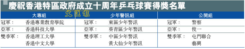 慶祝香港特區政府成立十周年乒乓球賽得獎名單 (圖)