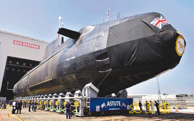 英國最大、具攻擊力的新一代「機敏」級(HMS Astute)超級隱形核潛艇(見圖),昨在王儲查爾斯妻子、康沃爾公爵夫人卡米拉主持下,舉行下水禮。有別於傳統下水禮,卡米拉棄用香檳,而選用船員釀製的啤酒來進行慶祝儀式。是次下水禮約有1萬人出席,當中包括潛艇工人、船員、軍方將領、貴賓和學童等。 ■綜合外電消息