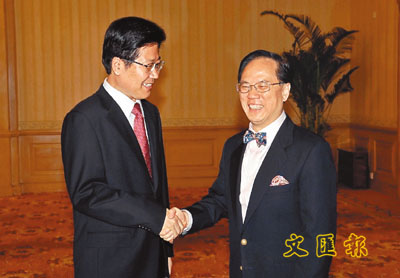 ■特首曾蔭權(右)與湖南省委書記張春賢握手。