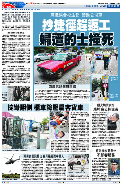 【本報訊】沙田馬場昨發生奪命車禍,馬會電話投注部一名女員工疑因錯過公司車,在自行上班時走捷徑,取道行車天橋後橫過有4條行車線的馬路時,不幸被的士撞到拋上車頭再彈開6米遠倒地,當場頭爆昏迷,送院告傷重不治。女死者林玉群,54歲,任職馬會電話投注部兼職員工超過10年。消息稱,懷疑她錯過返馬場的穿梭巴士,為趕在中午開賽前返工而行捷徑,不幸死於的士輪下。