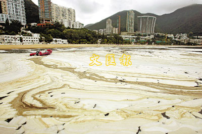 淺水灣海面昨呈現明顯啡紅色,紅潮面積很大,已逼近岸邊。康文署人員在場不斷廣播,並貼出告示,呼籲泳客不要下水,昨日雖為周六,但泳客不多,有市民形容海水「又腥又臭」,雖到達沙灘也不能下水游泳。亦有人不怕紅潮,仍然落水游出浮台。