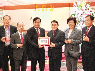 ■廠商會副會長尹德勝(右三)於昆明市政府招待會上致送紀念品予昆明市市長張祖林(左三)。