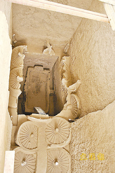 ■9日,陝西韓城梁帶村兩周墓地遺址發現中國最早的木俑,比秦兵馬俑早500多年。圖為出土的木俑和馬車。本報記者熊曉芳 攝