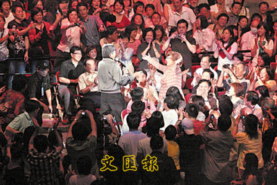 【本報訊】林子祥和杜麗莎合作的演唱會,前晚的演出吸引了仍在休養中的肥姐沈殿霞前來欣賞。肥姐已經很久沒有出席公開場合,前晚她在好友鄧光榮太太的陪同下出現,並坐在第一行欣賞演出。當演唱中途林子祥和觀眾握手時看到肥姐,兩人也即時來個擁抱,全場掌聲鼓動。久未露面的肥姐看起來精神不錯,她更看到晚上十一時半才離去。