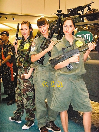 【本報訊】三位模特兒Ana R.、陳嘉容及莊思敏昨日出席商場一個軍備展活動,三女分別穿上軍裝,並站在不同軍車面前給傳媒拍照。