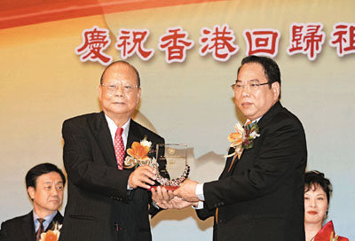 【本報訊】(記者 沈清麗)香港地區中國和平統一促進會(簡稱和統會),昨日假尖沙咀洲際酒店召開「促進中國和平統一研討會」後,隨即再隆重舉辦「慶祝香港回歸祖國十周年」晚會。晚會吸引了來自中央政府官員和兩岸四地的專家學者、嘉賓好友近700人參與。國務院台灣事務辦公室副主任葉克冬、中聯辦副主任黎桂康、全國人大常委曾憲梓、行政會議召集人梁振英蒞臨大會擔任主禮嘉賓。