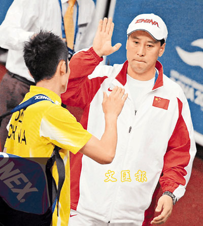■中國羽隊主帥李永波跟林丹擊掌慶祝。 新華社