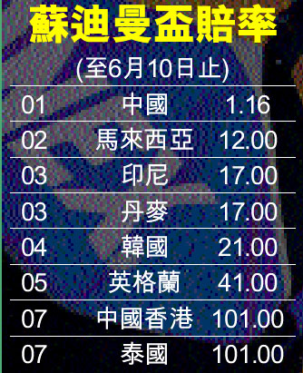 蘇迪曼盃賠率(至6月10日止) (圖)