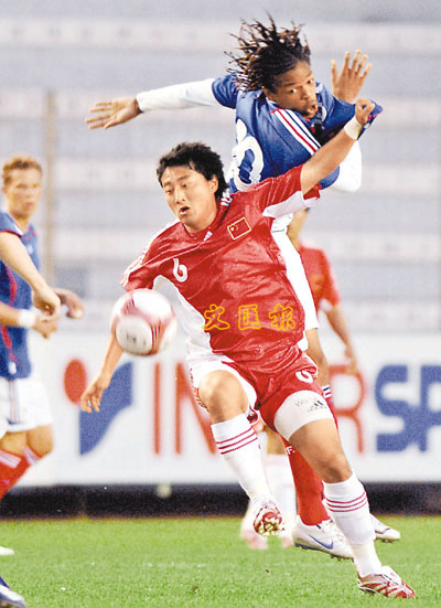 中國隊在開局後並不保守,與法國隊展開對攻,但法國隊逐漸展示了實力上的優勢。第12分鐘,後衛白磊拉人犯規令法國隊獲得任意球。博內將球傳出後,于海在混戰中把球鏟出禁區,但加梅羅得球後右腳勁射,球從兩名中國隊員中穿過入網。加梅洛在第24分鐘為法國再下一城。他在中路得球後與右側的法蒂形成傳遞配合,再度得球後橫向一趟擺脫萬厚良,突至禁區前偏右位置後大力低射破門。