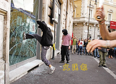 ■羅馬爆發反布什示威,一名蒙面示威者飛腳踢爛一間銀行的玻璃窗。 美聯社