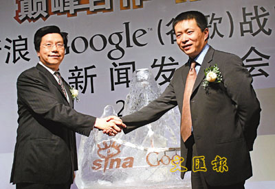 全球最大的搜索引擎公司Google與世界最大的中文門戶網站新浪,11日在北京宣佈正式達成戰略合作關係,這意味著Google加快在中國的本土化進程。圖為新浪首席執行官曹國偉(右)與Google大中華區總裁李開復(左)在新聞發布會上握手。彭博社