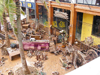 6月10日清晨,因暴雨積水倒灌,深圳額蛇口海上世界地下廣場已經變成汪洋大海。廣場由地下和地上兩層組成。地下一層的20多家商舖已經全部被淹,中間較大的一兩家商舖也僅僅露出頂上的招牌。廣場黃色的水面上漂浮著商舖的凳子、沙發和遮陽傘,岸邊沖積了不少黃色淤泥。