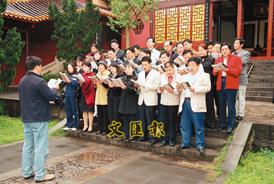 ■在湖南長沙千年學府岳麓書院文廟大殿前,部分來自清華大學職業經理訓練中心的企業家手捧《四書集注》,齊聲朗誦《大學章句》。主要由企業家、專業人士、知識分子組成的新社會階層,在經濟以至社會發展中起著舉足輕重的作用。資料圖片