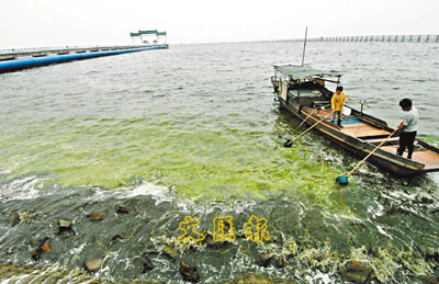 ■今年4月以來,太湖部分水域大規模暴發藍藻,導致無錫飲用水水源地受到嚴重影響。圖為無錫市自來水總公司的工作人員在取水口附近水域打撈藍藻。資料圖片