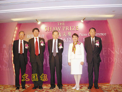 ■第四屆邵逸夫獎昨公佈獲獎名單。圖為邵逸夫獎理事會成員,中為邵逸夫獎評審會主席楊振寧。本報記者唐苗苗 攝