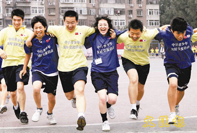13日,日本高中生代表團代表(著藍色衣服者)和北京十九中的學生一起做搭肩跑遊戲。當日,日本高中生代表團200多人在中日邦交正常化35周年之際應邀訪華。 新華社