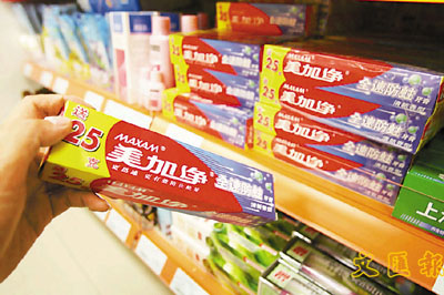 上海聯華超市6月上旬和5月下旬的牙膏銷售數據顯示,國產牙膏銷售正常。在聯華、家樂福等超市,「美加淨」、「三七」、「田七」等牙膏在架上仍有售,一些消費者正在選購這些品牌的牙膏。