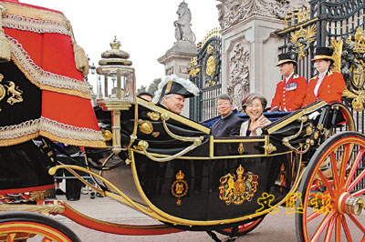 12日,中國新任駐英國大使傅瑩(右三)向英國女王伊麗莎白二世遞交國書後,乘坐傳統的英國王室馬車離開白金漢宮。傅瑩向女王轉達了中國國家主席胡錦濤對她的生日祝賀和良好祝願,並向女王贈送了一套經過精心複製的《欽藏英皇全景大典》畫冊。 新華社