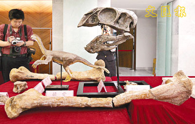 ■二連巨盜龍部分骨骼化石及巨盜龍復原模型。 法新社