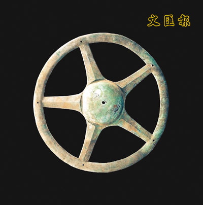 ¡@This implement was found smashed and burnt when unearthed. Only two of the original six sun discs have been restored. The function of this wheel-like disc is still elusive. It could have been a wheel or an ornament on a shield, but the most current view is that it stands for the sun, as its features are similar to the petroglyph of the hanging coffins in Gong county in Sichuan, and the sun-patterned carvings on the bronze drums unearthed in southern China. It shows that sun worship was part of the religious culture of the ancient Shu State.