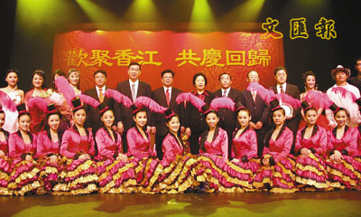 ■廣東駐港企業舉辦慶祝香港回歸10周年文藝晚會,演出結束後,周俊明、胡澤君、王遼平和李文岳等嘉賓與表演藝員合照留念。 本報記者沈清麗 攝