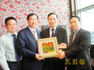 ■福州市委書記袁榮祥(右二)向韓國龍(左二)贈送福州的特色漆畫。 本報記者武毅田 攝