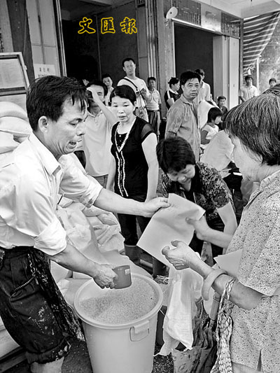 ■正在領取救災米的災民,現在災區的大米缺口已經超過2000噸了。 本報記者 攝