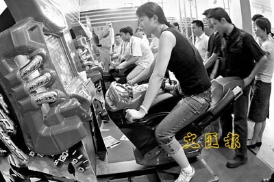 ■北京青年體驗風馳電掣的「飆車」感覺。第11屆中國國際軟體博覽會即將在北京展覽館舉行。本屆軟博會主題為「展自主創新成果,創中國軟體品牌,促軟體產業發展」。 中新社