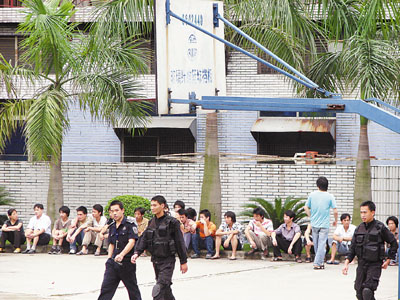 ■全副武裝的警察在廠區內走動。 本報記者胡明 攝