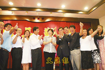 ■福建省副省長王美香(左五)與金門縣長李炷烽(左四)等兩地官員,同台歡呼「福建金門,都是親人」。本報記者李東波 攝