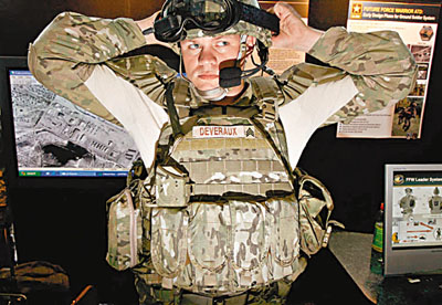 這位兵哥身上的裝備,就是稱為「未來軍力戰士」的美軍高科技戰鬥武裝,成為早前於「美軍士兵現代化」博覽上出展的其中展品。這套未來戰士裝束,包括衛星導航、先進傳訊系統、隨身武器及各樣電腦裝備。據稱裝備,主要方便地面與空中部隊協調,有利於作戰調配等等。