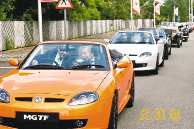 ■5月29日,在英國朗布里奇第一輛下線的南汽MG TF跑車(前)引領當天下線的其他車及MG老爺車巡遊。