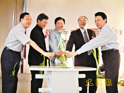 ■羅康瑞與重慶市市長王鴻舉、常務副市長黃奇帆,副市長余遠牧、重慶渝中區書記劉學普共同啟動重慶天地項目。 本報記者徐家強 攝